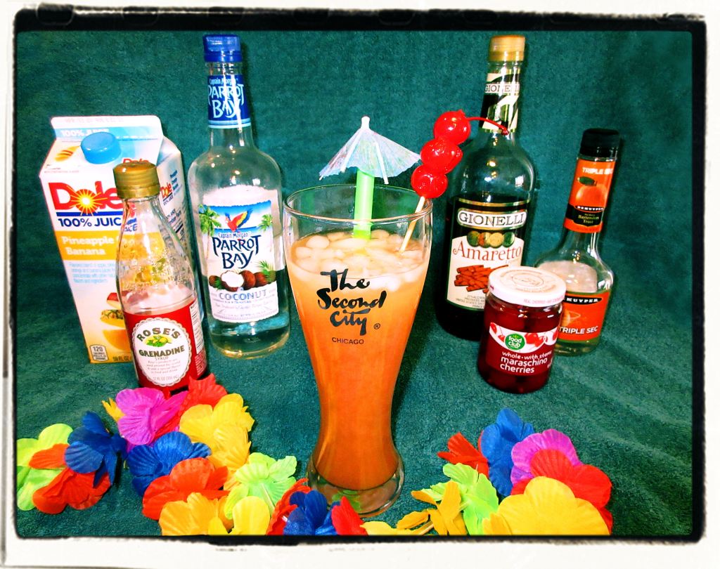 - Mix all of the above ingredients in my husband’s malt cup and pour it into a wheat beer glass I got at Second City comedy club in Chicago that’s 1/3 filled with crushed ice (Second City logo is optional)